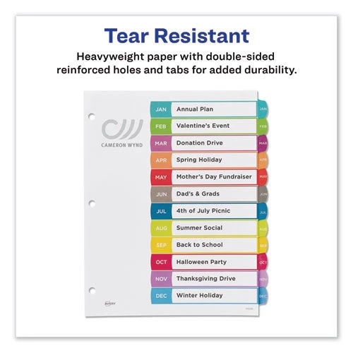 - White preprinted months Jan – Dec on vibrant multicolor tabs