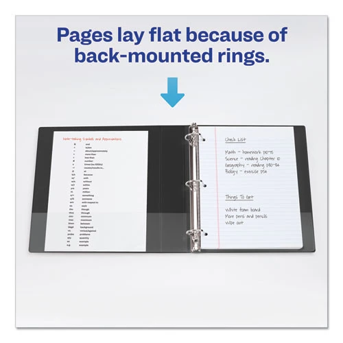 - Pages lie flat with back-mounted rings; exposed rivets on back